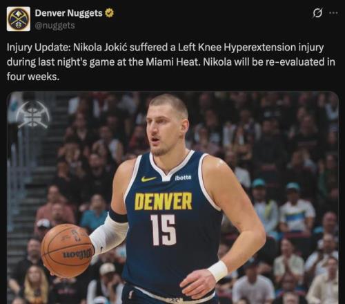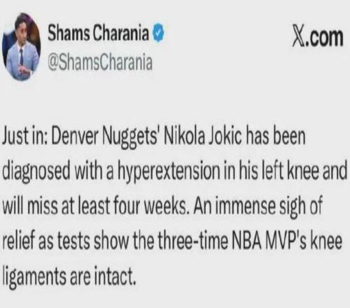 爆料王Shams:約基奇膝蓋過度伸展,韌帶完好無損,但也需要至少休戰(zhàn)四周時間。