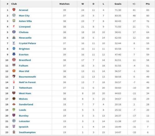 英超2025年積分榜:阿森納83分居首,曼城第二利物浦第四