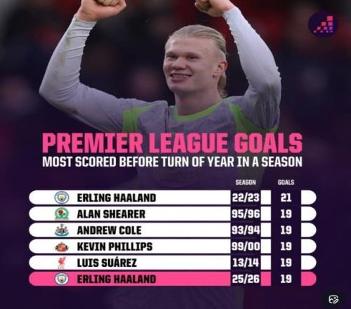 12月31報(bào)道 2025年英超戰(zhàn)罷,數(shù)據(jù)網(wǎng)站OPTA也盤(pán)點(diǎn)了英超歷史在新年之前射手榜,其中本賽季哈蘭德19球并列次席,紀(jì)錄也由自己保持。