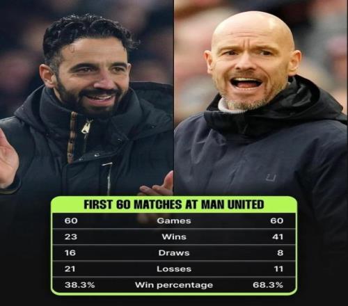 阿莫林執(zhí)教曼聯(lián)前60場(chǎng)23勝勝率38.3%,滕哈赫勝率68.3%