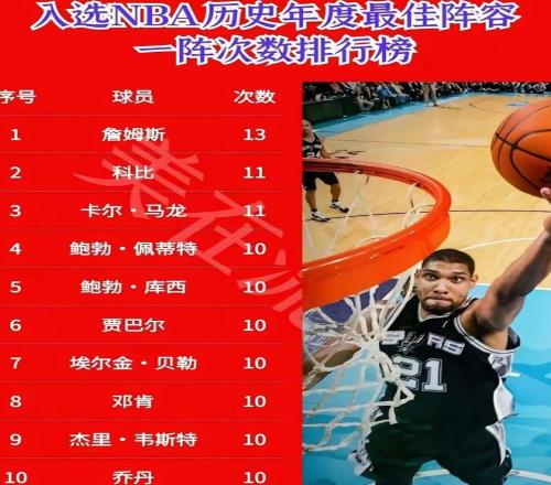 最佳一陣是NBA常規(guī)賽個(gè)人榮譽(yù)的頂級(jí)象征,代表著球員在當(dāng)賽季的表現(xiàn)處于聯(lián)盟頂級(jí)水平。詹姆斯的職業(yè)生涯中,累計(jì)獲得了13次最佳一陣,遠(yuǎn)超排名第二的科比和馬龍(均為11次),成為NBA歷史上獲得最佳一陣次數(shù)最多的球員。