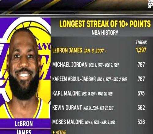 五、連續(xù)得分上雙紀(jì)錄1297場(chǎng):歷史第一的“穩(wěn)定之王”