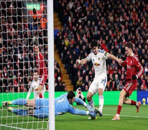 2天后要奔赴倫敦連戰(zhàn)富勒姆和阿森納,面對客場防守稀松的利茲聯(lián)(此前客場比賽全部有丟球),斯洛特繼續(xù)將小傷在身的維爾茨放在了前場偏左的位置,畢竟上輪對壘狼隊,德國人就在這個角色上干得不錯。開場階段,維爾茨和?;倏说暮魬驳拇_不少,法國前鋒首次射正被盧卡斯·佩里撲出后,第二次內(nèi)切選擇找到小禁區(qū)邊緣的維爾茨,但后者跟進推射被封堵。眼見客隊三中衛(wèi)守得腹地密不透風,利物浦由瓊斯等人逐漸增加外圍發(fā)炮,孰料本方禁區(qū)卻險些被偷襲得手。阿利松幾乎沒有難度的出球直接送到安帕杜腳下,好在后者也沒做足射門準備,掄了一腳也是回傳力度。