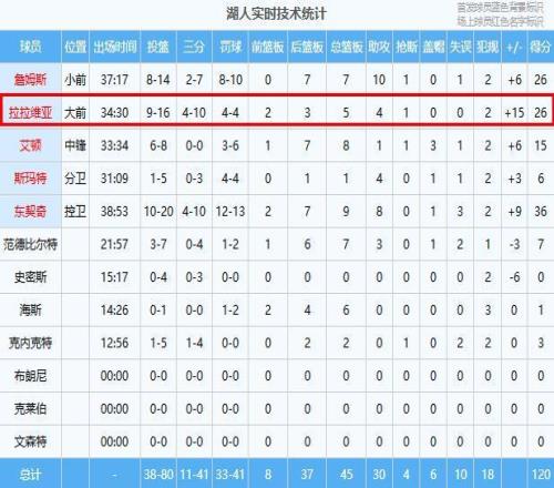 東契奇36分9板8助、詹姆斯26分7板10助、拉拉維亞26分5板4助、艾頓15分8板1助3帽、范德比爾特7分7板3助、斯瑪特6分1板4助、克內(nèi)克特3分2板、海斯1分6板