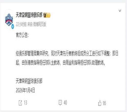 昨天(1月4日),天津榮鋼籃球俱樂(lè)部發(fā)布官方公告: