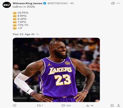 進入2026年后,詹姆斯兩場比賽場均29分8籃板8助攻1搶斷,真實命中率73%,正負值+17,這四項數(shù)據(jù)出爐后湖人媒體再度盛贊勒布朗就是GOAT。