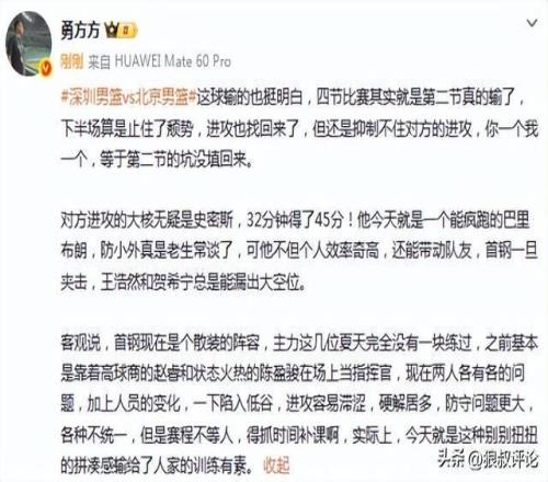 媒體人勇方方發(fā)文點(diǎn)評(píng):這球輸?shù)囊餐γ靼?,四?jié)比賽其實(shí)就是第二節(jié)真的輸了,下半場(chǎng)算是止住了頹勢(shì),進(jìn)攻也找回來(lái)了,但還是抑制不住對(duì)方的進(jìn)攻,你一個(gè)我一個(gè),等于第二節(jié)的坑沒(méi)填回來(lái)。