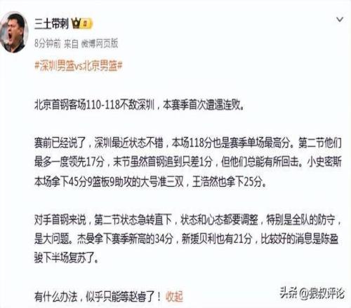 北京時(shí)間1月11日,CBA常規(guī)賽繼續(xù)開(kāi)打,北京110-118不敵深圳,新賽季吃到四場(chǎng)敗仗,首次遭遇連敗。