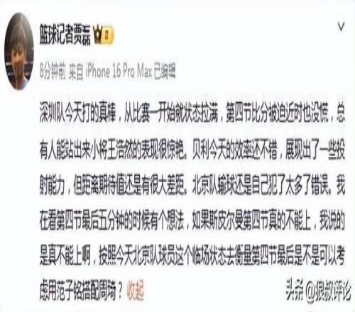 籃球記者賈磊發(fā)文點(diǎn)評(píng):“深圳隊(duì)今天打的真棒,從比賽一開(kāi)始就狀態(tài)拉滿,第四節(jié)比分被迫近時(shí)也沒(méi)慌,總有人能站出來(lái)小將王浩然的表現(xiàn)很驚艷。貝利今天的效率還不錯(cuò),展現(xiàn)出了一些投射能力,但距離期待值還是有很大差距。”