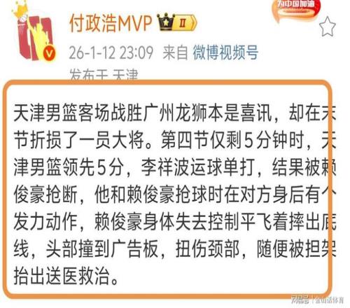 賽后,著名媒體人付政浩還原了事情真相,他在個人社媒上,詳盡解讀的賴俊豪受傷的過程?!褒埅{本是喜訊,卻在末節(jié)折損了一員大將。第四節(jié)僅剩5分鐘時,天津男籃領(lǐng)先5分,李祥波運球單打,結(jié)果被賴俊豪搶斷,他和賴俊豪搶球時在對方身后有個發(fā)力動作,賴俊豪身體失去控制平飛著摔出底線,頭部撞到廣告板,扭傷頸部,隨便被擔(dān)架抬出送醫(yī)救治?!薄?/p>