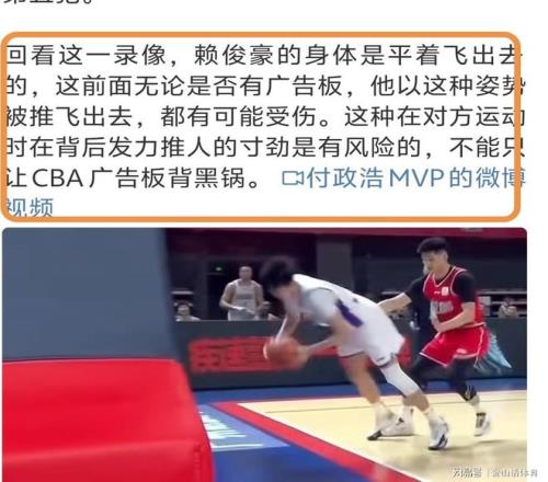 付政浩同時表示“賴俊豪搶斷后已經(jīng)控制住了球權(quán),李祥波是否沒必要再在他背后發(fā)力推那一下,值得商榷。職業(yè)球員在努力贏球的同時盡量注意保護一下對手?!?;“賴俊豪的身體是平著飛出去的,這前面無論是否有廣告板,他以這種姿勢被推飛出去,都有可能受傷。這種在對方運動時在背后發(fā)力推人的寸勁是有風(fēng)險的,不能只讓CBA廣告板背黑鍋?!?。