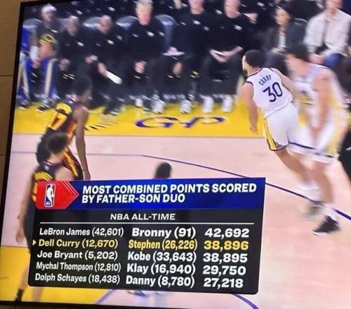 排名第二的是庫里父子,庫里26240分,父親戴爾庫里12670,父子總得分38910,第三是科比父子。
