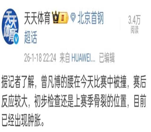 和寧波富邦的比賽,曾凡博和杰曼都出現(xiàn)了傷病情況,其中曾凡博的情況有些嚴(yán)重,他是腰部被撞了一下,賽后出現(xiàn)了腫脹的情況,檢查是上賽季出現(xiàn)骨裂的地方。北京首鋼稍后會(huì)安排曾凡博進(jìn)行更詳細(xì)的檢查,但估計(jì)會(huì)休息一段時(shí)間。