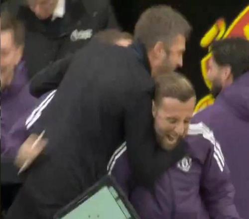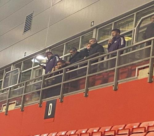 卡里克手捧咖啡,與曼聯(lián)體育總監(jiān)賈森·威爾考克斯、U18青年隊(duì)主教練達(dá)倫·弗萊徹以及一線隊(duì)教練組史蒂夫·霍蘭德、喬納森·伍德蓋特和喬尼·埃文斯一起出現(xiàn)在看臺(tái)上。