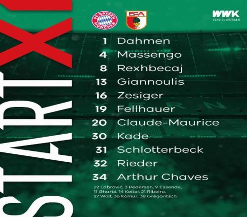 奧格斯堡首發(fā):1-達(dá)門、34-阿圖爾-查韋斯、31-凱文-施洛特貝克雷、16-澤西格爾、13-吉安努利斯、4-馬森戈、19-菲爾豪爾、8-雷克斯貝卡伊、20-毛里斯、32-法比安-里德、30-安東-卡德